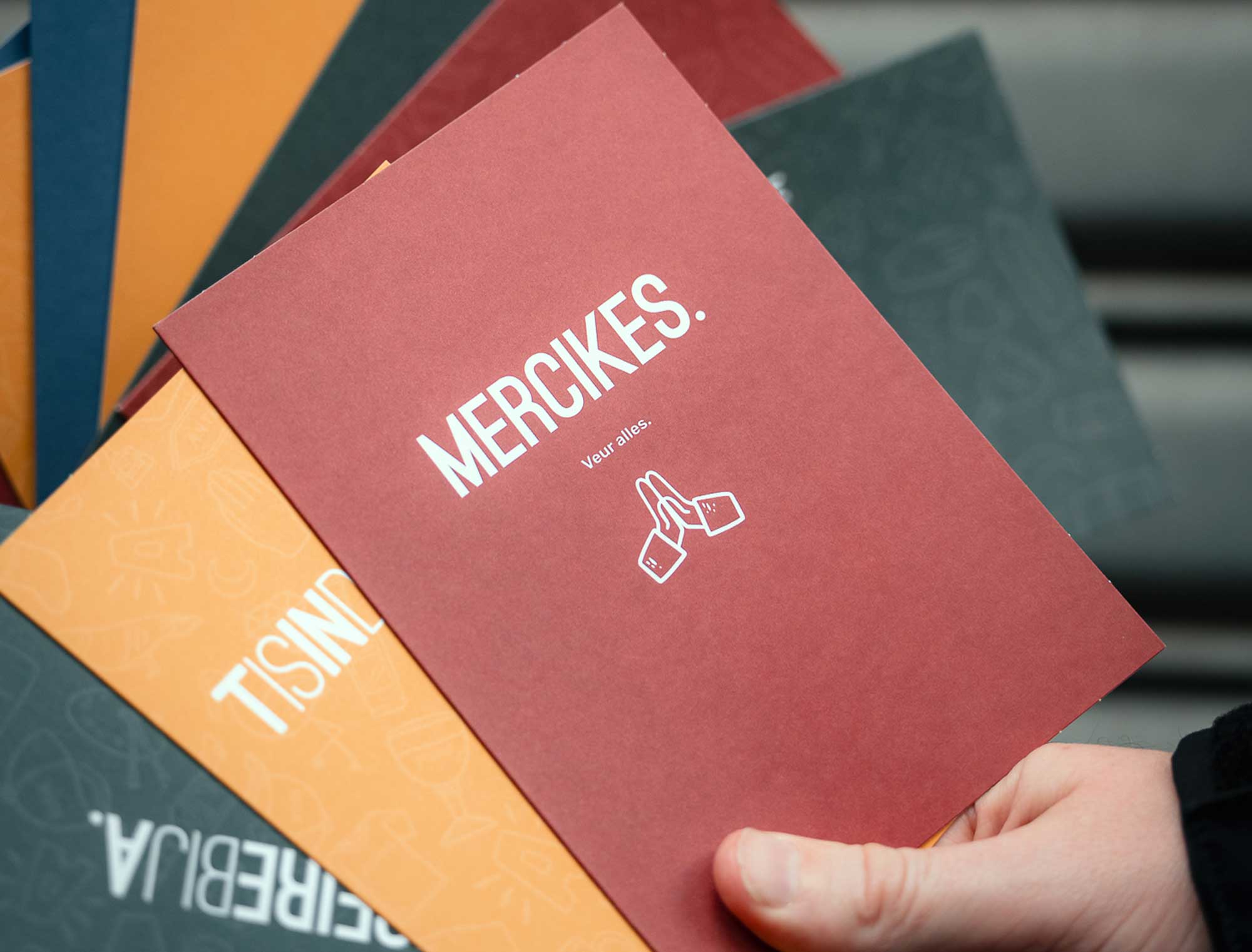 KZENVANDEKOART. bevat 25 wenskaarten mét enveloppe, allemaal voorzien van een prachtige uitspraak in de schoonste taal: het dialect van ’t Stad.