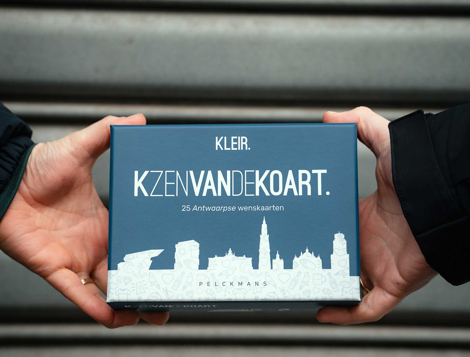 Samengesteld door Nick Daelemans en Mathias Vertessen, de paljaskes van KLEIR., die hun liefde voor Antwerpen bezingen met originele sweaters en T-shirts met typisch Antwaarpse uitspraken als KEMDUST., ALLOKES. en KDACHTETNI. De perfecte wenskaarten voor alle apsjaars en masjoefels.