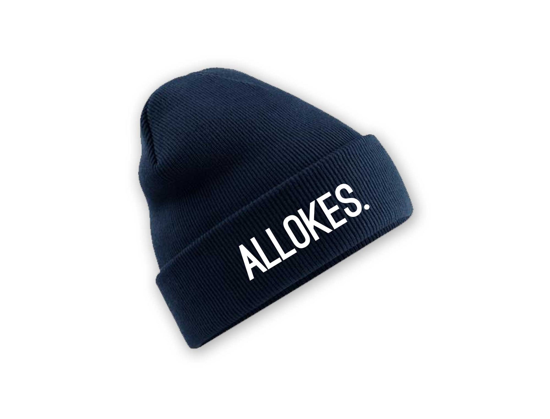 Vrouw met een blauwe muts met opdruk ALLOKES.
