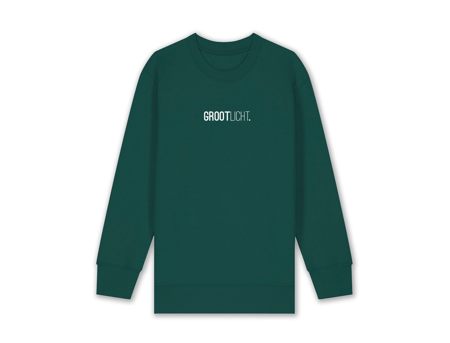 Groene sweater met opschrift GROOT LICHT. voor kinderen. Als cadeau of gewoon voor jezelf. Recht uit Antwerpen. Met trots voor het dialect.