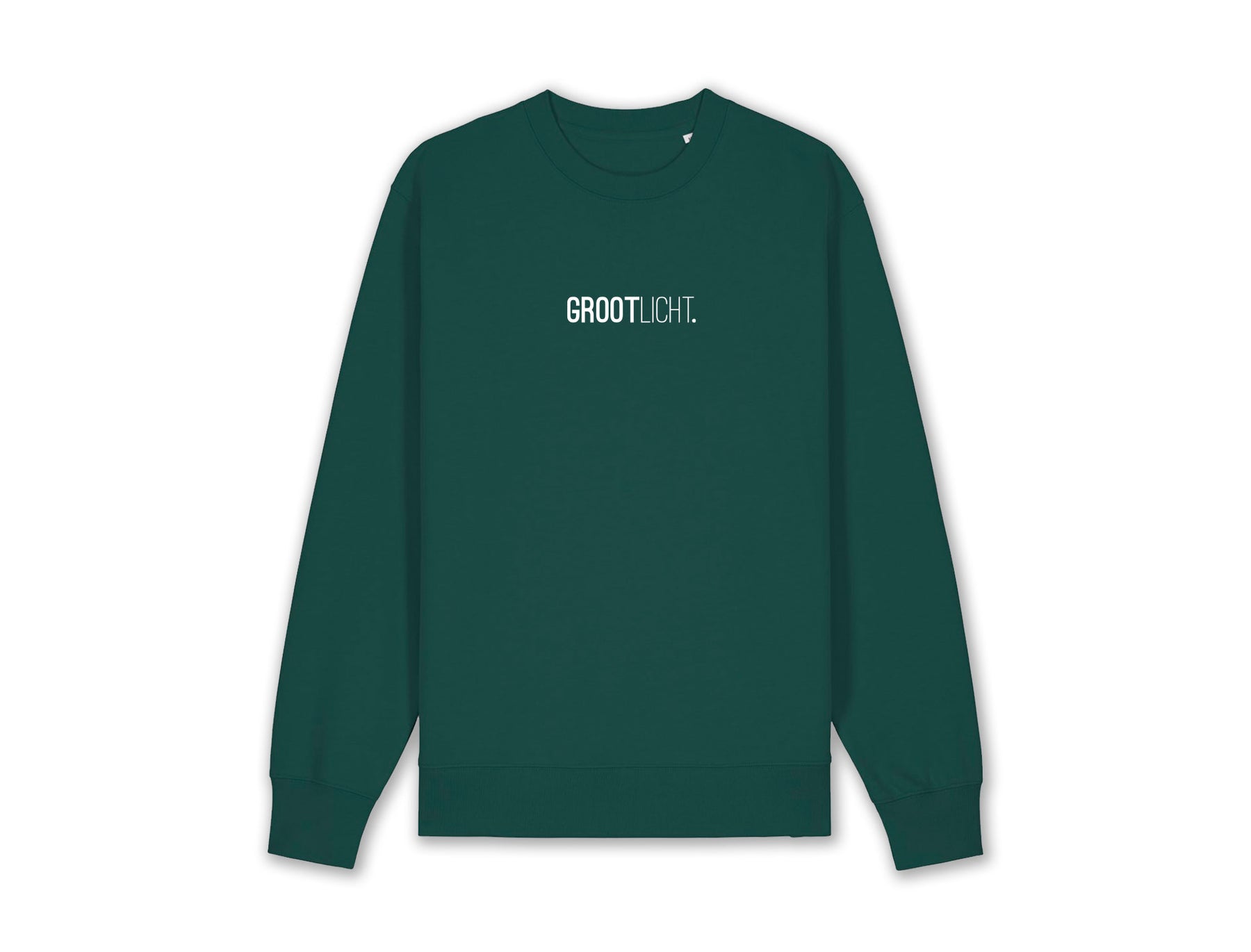 Groene sweater met opschrift GROOT LICHT. voor volwassenen. Als cadeau of gewoon voor jezelf. Recht uit Antwerpen. Met trots voor het dialect.