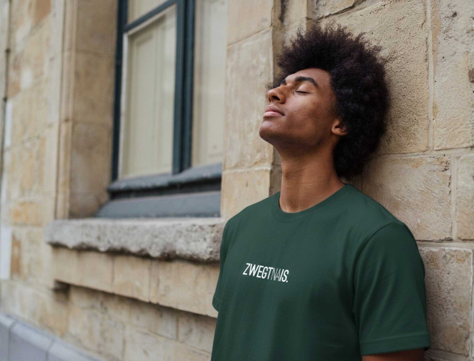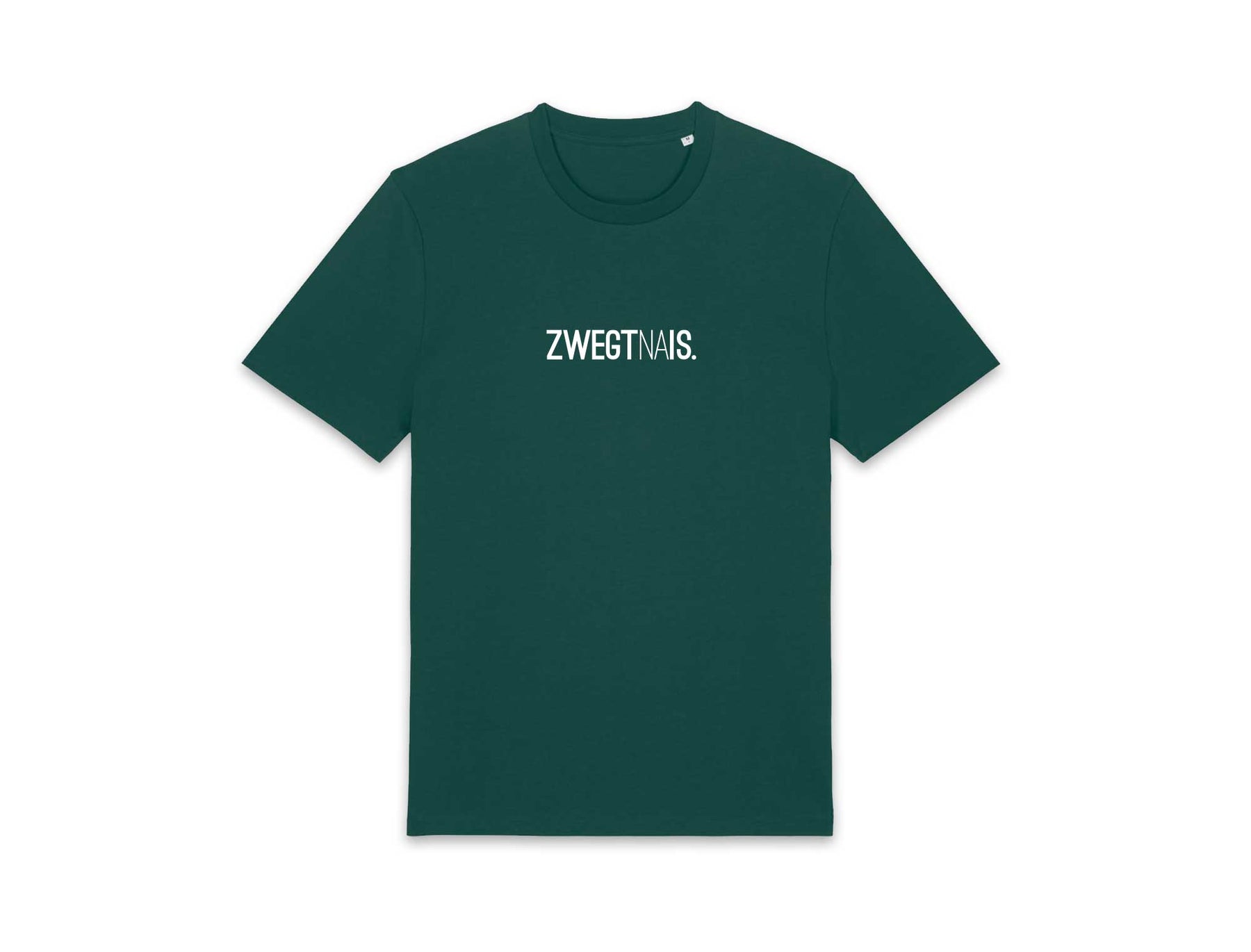Groene T-shirt met opschrift ZWEGTNAIS. voor volwassenen. Als cadeau of gewoon voor jezelf. Recht uit Antwerpen. Met trots voor het dialect.